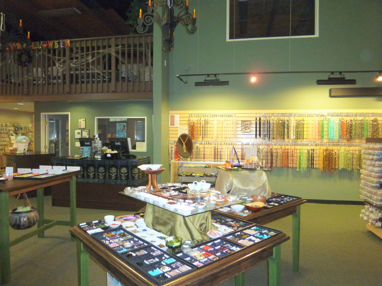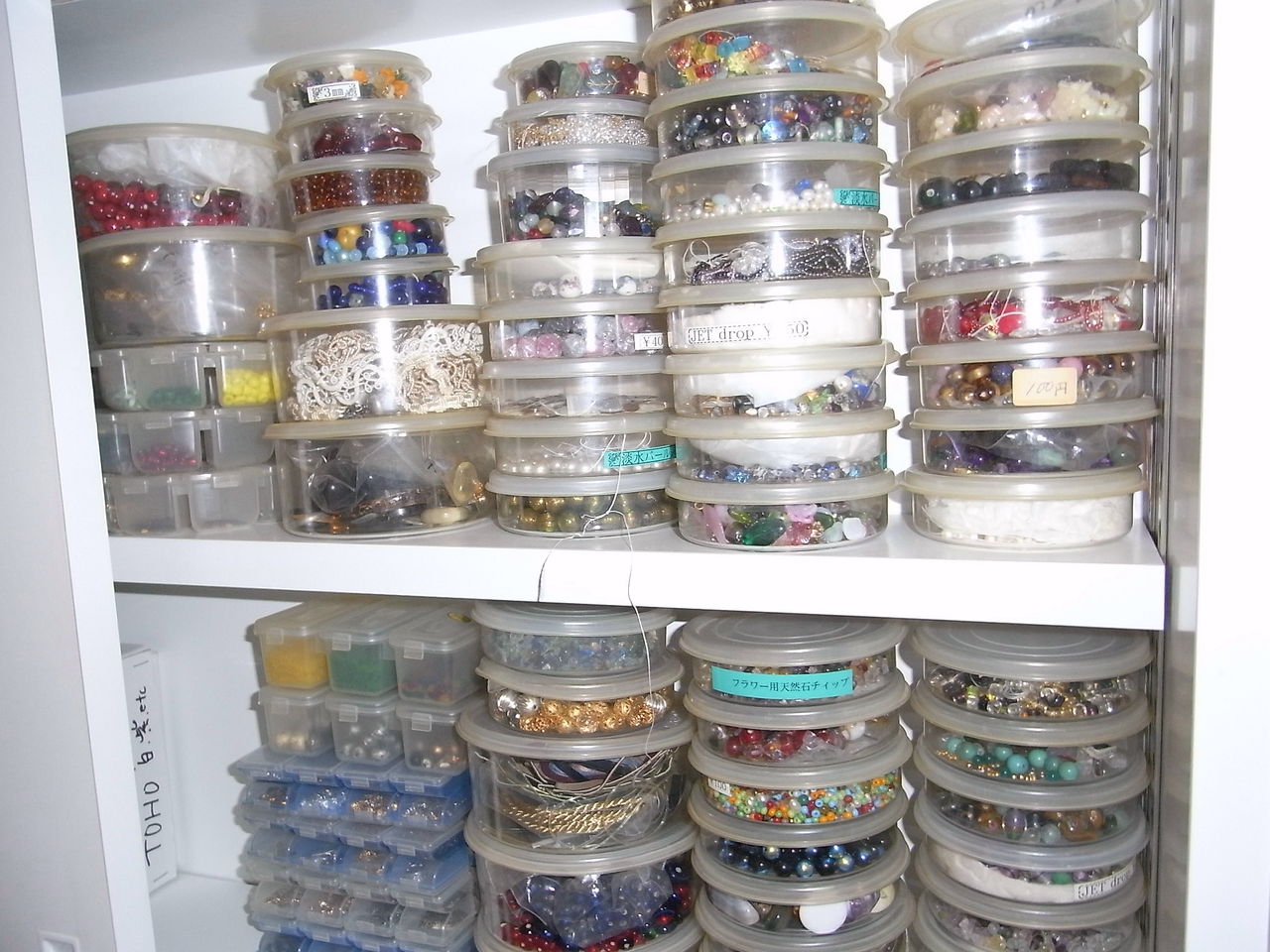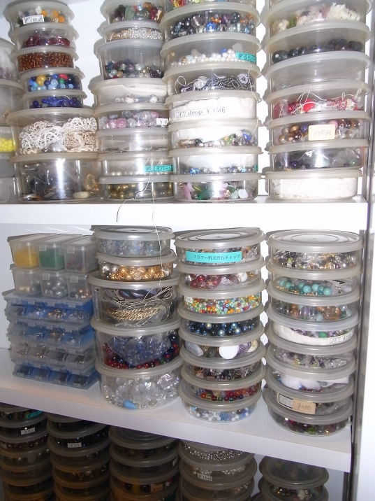画像は1階のビーズ棚です。2階のアトリエに収まりきらず、