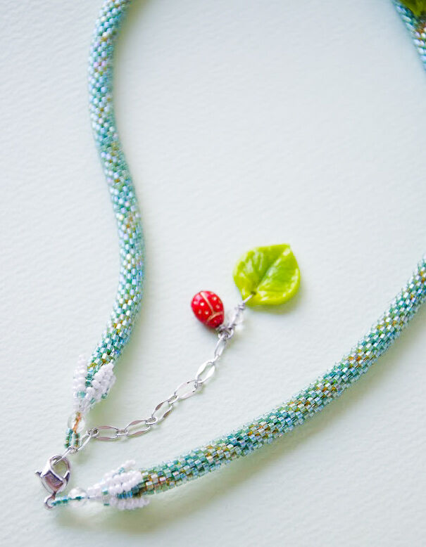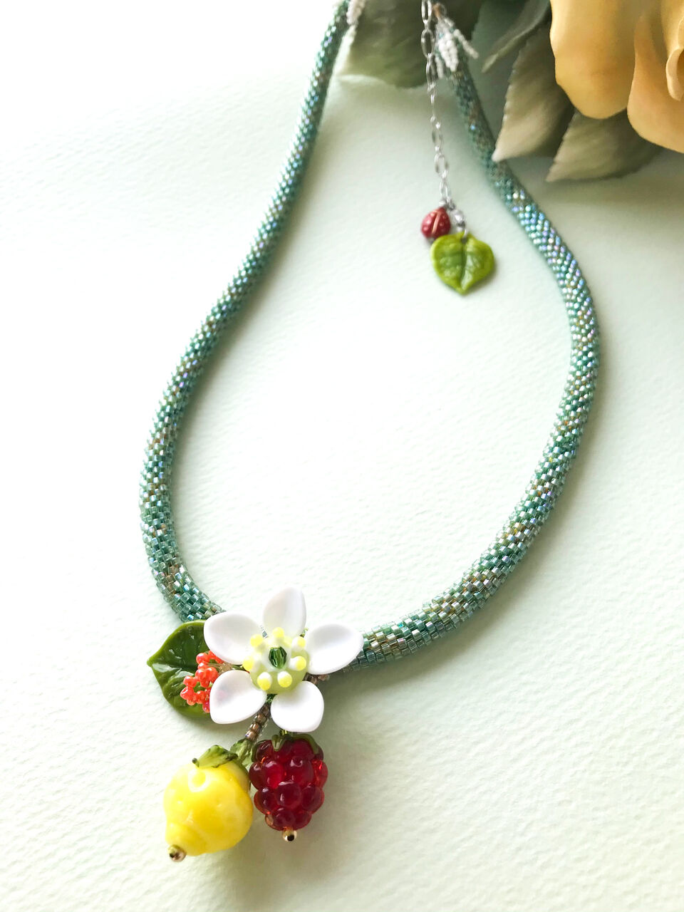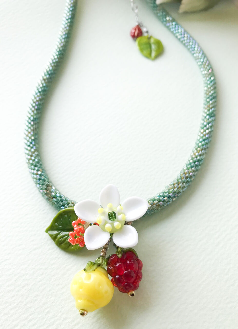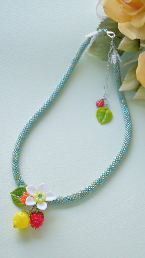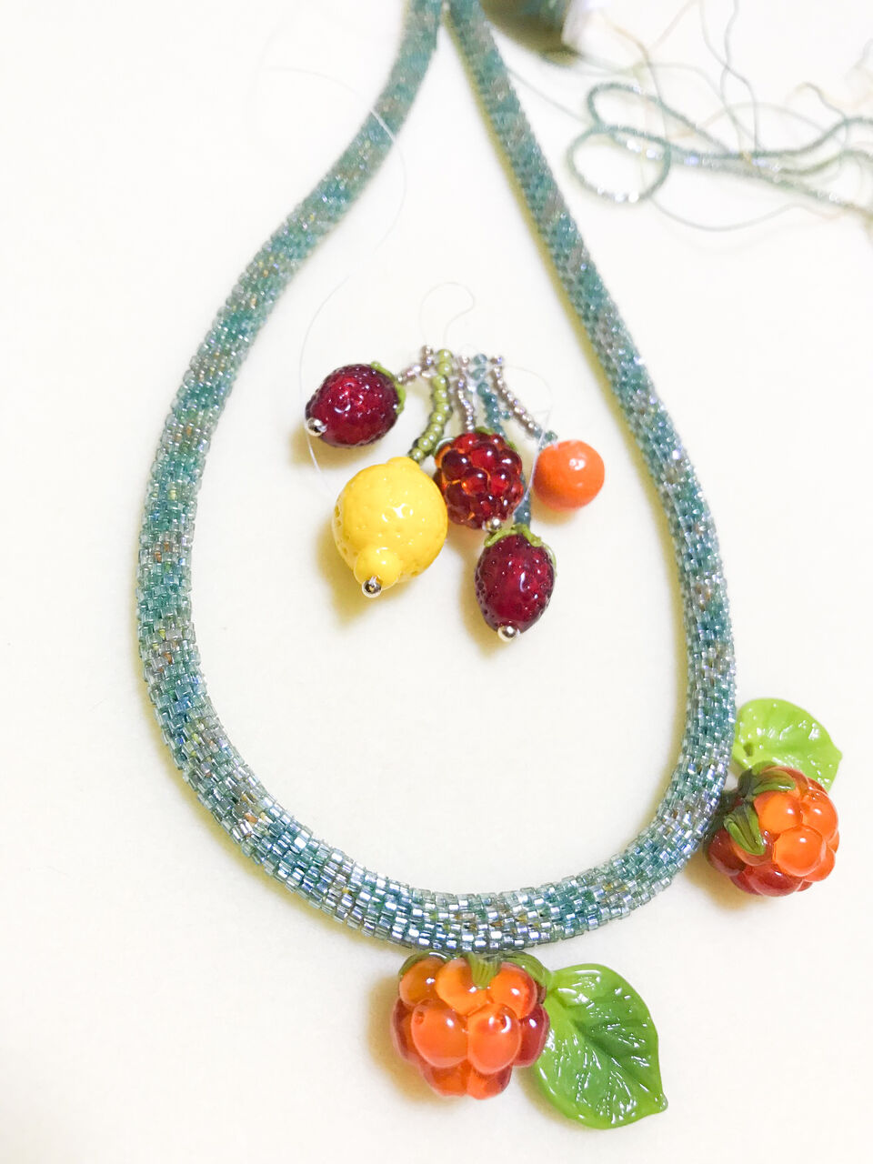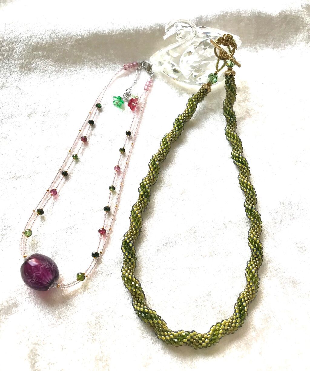 グリーンのクロッシェネックレスとピンクのとんぼ玉ネックレス